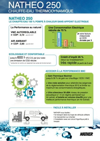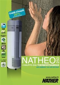 <!--#WYSIWYG#--><p><br /> Chauffe-Eau Thermodynamique Nather<strong> NATHÉO 250 Monobloc<br /> <br /> Caractéristiques NATHER Nathéo 250 Monobloc</strong><br /> <br /> <strong>Référence :</strong> 100003<br /> <strong>Capacité :</strong> de 250 Litres<br /> <strong>Cuve :</strong> Acier émaillé <br /> <strong></strong><strong>Version :</strong> Nathéo 250 Thermodynamique Monobloc<br /> <strong>Type :</strong> Sur air ambiant ou air extrait<br /> <strong>Pose : </strong>Stable<br /> <strong>Diamètre : </strong>578 mm<br /> <strong>Hauteur :</strong> 1814 mm<br /> <strong>Alimentation électrique</strong> : Monophasé<br /> <strong>COP :</strong> 3.65 sur Air Extrait (VMC Auto réglable)<br /> <strong>COP :</strong> 3.40 sur Air Ambiant<br /> <strong>Résistance électrique</strong> : 1000 W Stéatite (en secours uniquement).<br /> <strong>Produit :</strong> <strong><span style="color: rgb(0, 48, 177);">Jusqu'à 70% d'énergie gratuite</span></strong><br /> <br /> <strong>Nathéo 250 tout en un</strong> (pompe à chaleur et ballon réunis en un seul appareil) permet d'assurer un confort sanitaire répondant aux besoins d’une famille de <strong><span style="color: rgb(0, 48, 177);">deux à</span><span style="color: rgb(0, 48, 177);"><span style="color: rgb(0, 48, 177);"> six </span>personnes</span></strong>. Une pompe à chaleur extrêmement performante (COP de 3,65) utilise les calories de l'air ambiant ou de l'air extrait par votre VMC pour chauffer votre eau<strong>.</strong><br /> <br /> Garantie composants :<strong><span style="color: rgb(0, 48, 177);"> 2 ans</span></strong><br /> Garantie cuve : <strong><span style="color: rgb(0, 48, 177);">5 ans </span></strong></p>